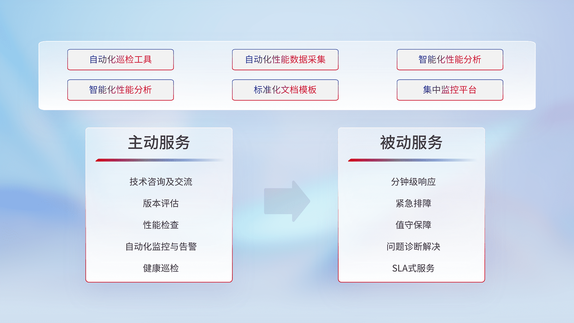 智能化工具和标准化文档,,,,保障服务质量,,,,提供主动服务(包含技术咨询、、、版本评估、、、性能检查、、、自动化监控与告警、、、、健康巡检)和被动服务包含(分钟级响应、、、紧急排障、、值守保障、、、、问题诊断解决、、、、SLA服务)。。